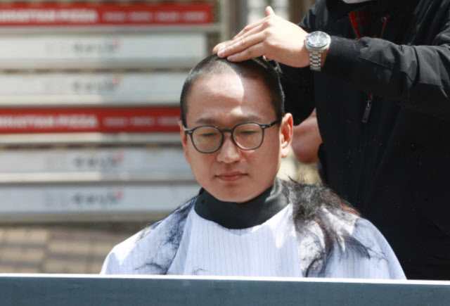 유튜버로 활동 중인 코미디언 김영민 씨가 2024년 5월 서울 여의도 국민의힘 당사 앞에서 당시 더불어민주당이 추진한 '전국민 1인당 민생회복지원금 25만원 지급'에 반대하며 삭발식을 하고 있다.(사진=연합뉴스)